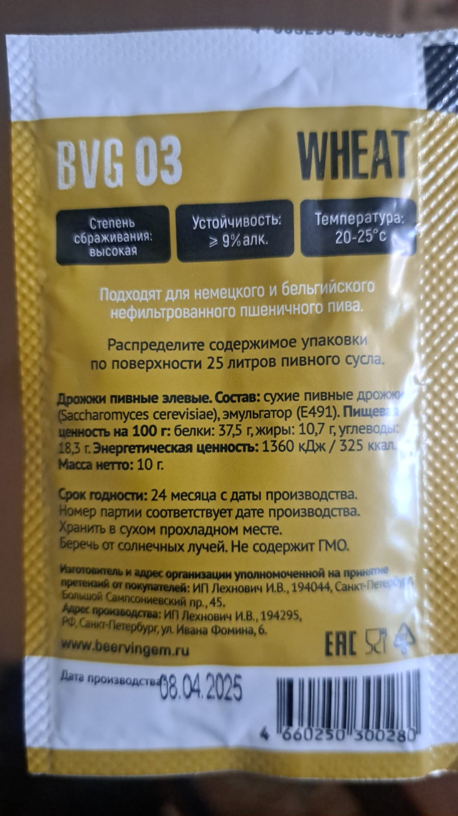 Дозировка: Упаковки 12 г дрожжей достаточно на 18-25 л пивного сусла.