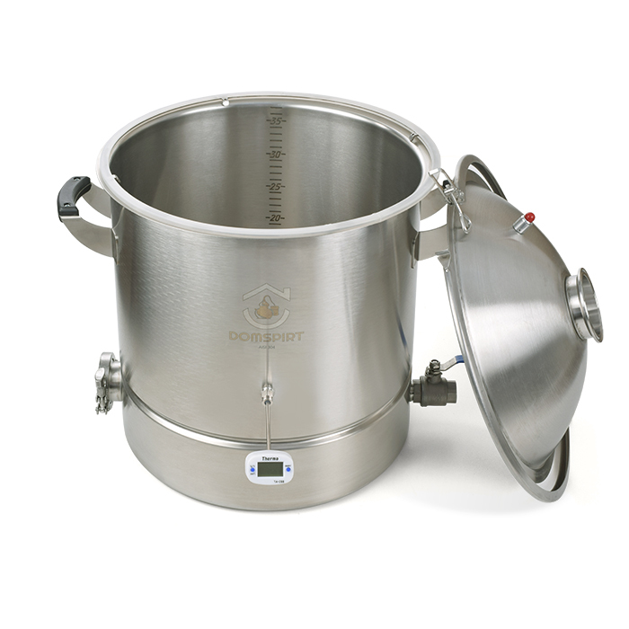 В кубе аппарата Domspirt 2 учтены все нюансы работы с зерновыми заторами. Например, при осахаривании крайне важна точность температурного режима — для этого в куб установили электронный термометр, который способен точно и быстро отслеживать малейшие изменения температуры.