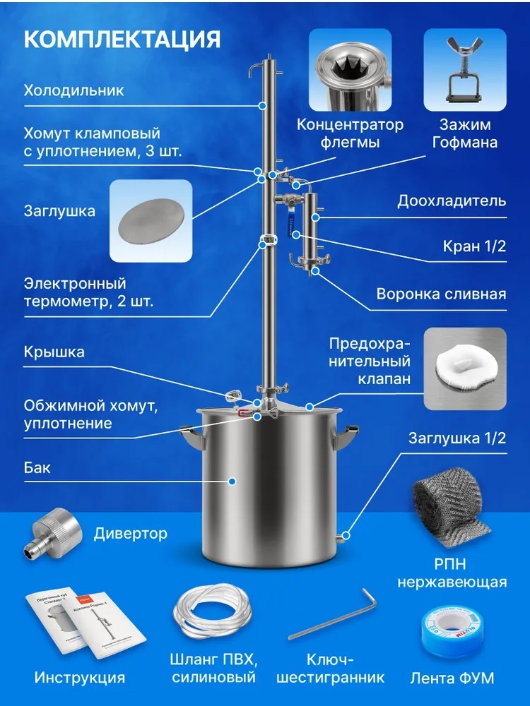 • РПН 2 метра - для получения спирта 93 градуса в базовой комплектацииШланг ПВХ 6м - для подключения к водопроводуШланг силиконовый 1м - для отбора продукта